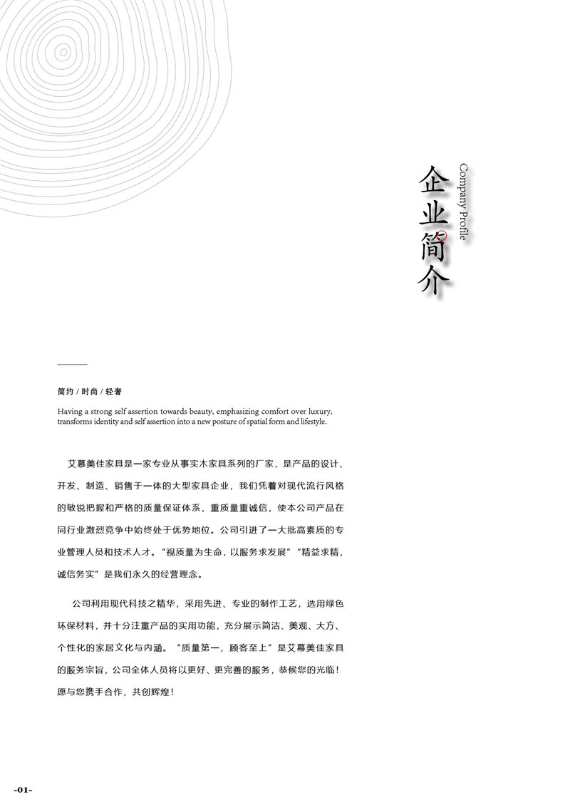 公司利用現代科技之精華,采用先進、專業的制作工藝,選用綠色環保材料,并十分注重產品的實用功能,充分展示簡潔、美觀、大方個性化的家居文化與內涵。“質量第一,顧客至上”是艾幕美佳家具的服務宗旨,公司全體人員將以更好、更完善的服務,恭候您的光臨!愿與您攜手合作,共創輝煌!