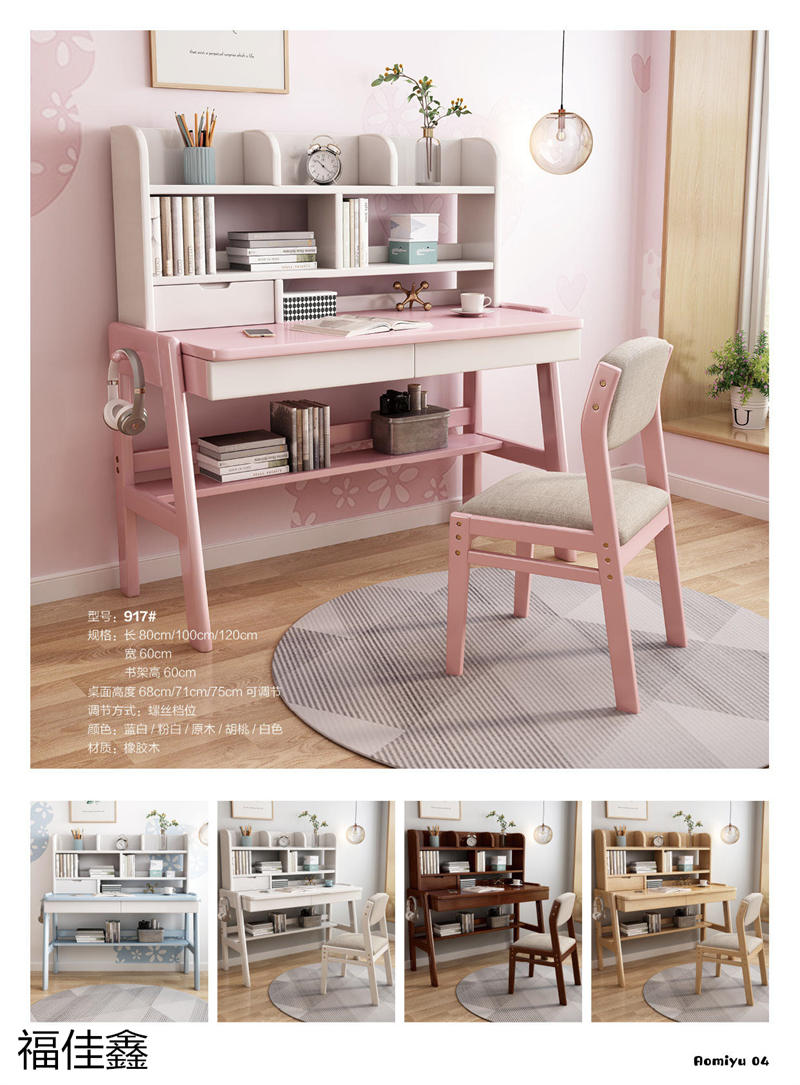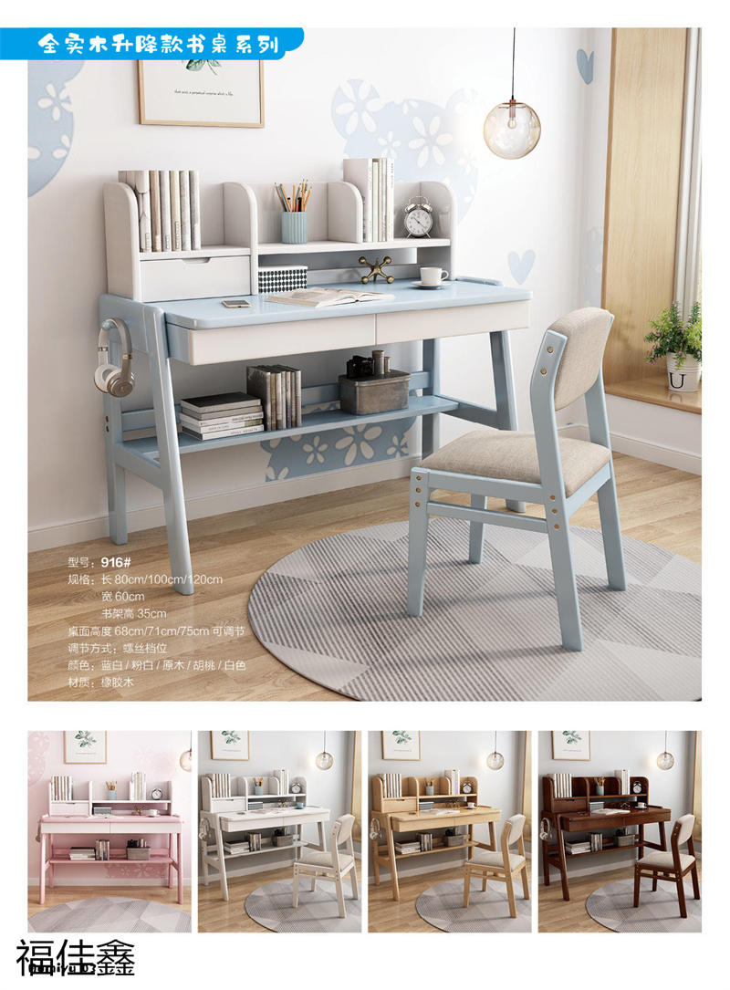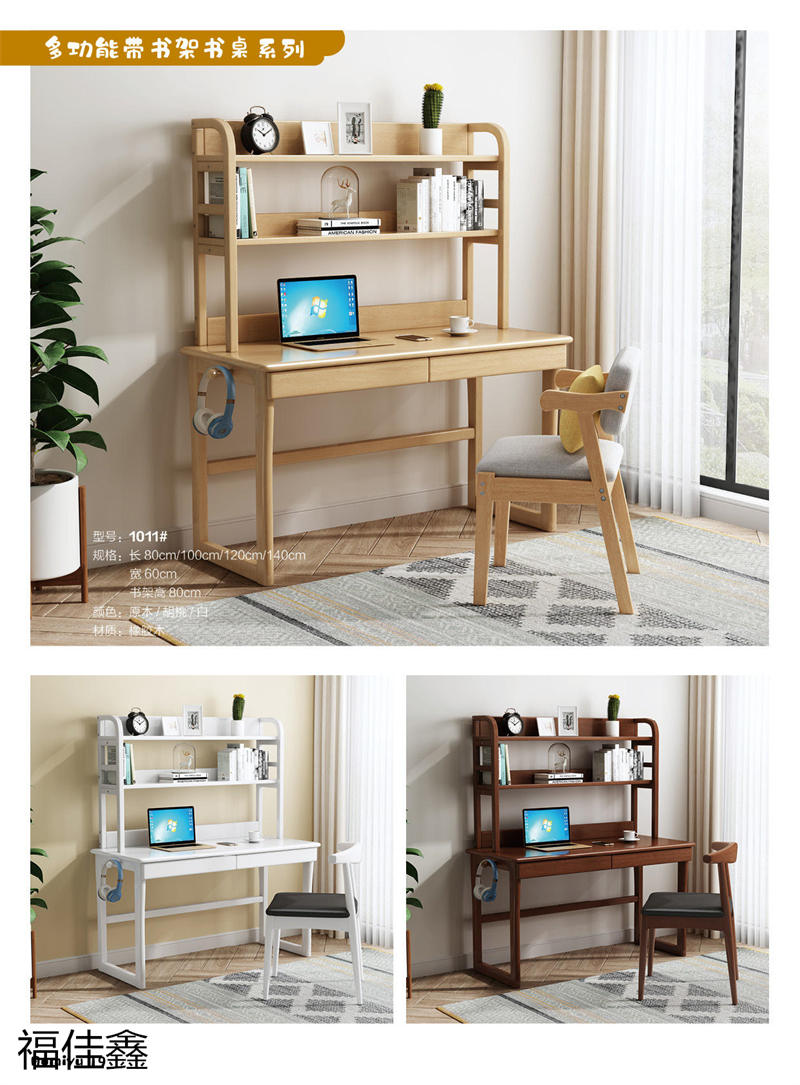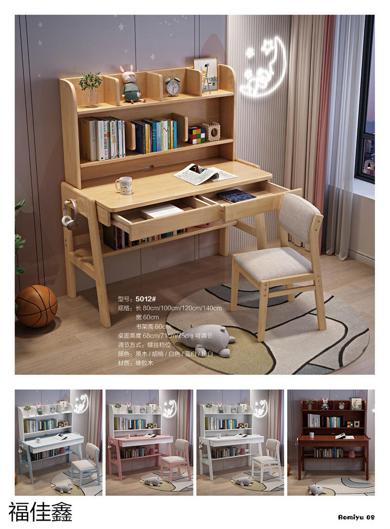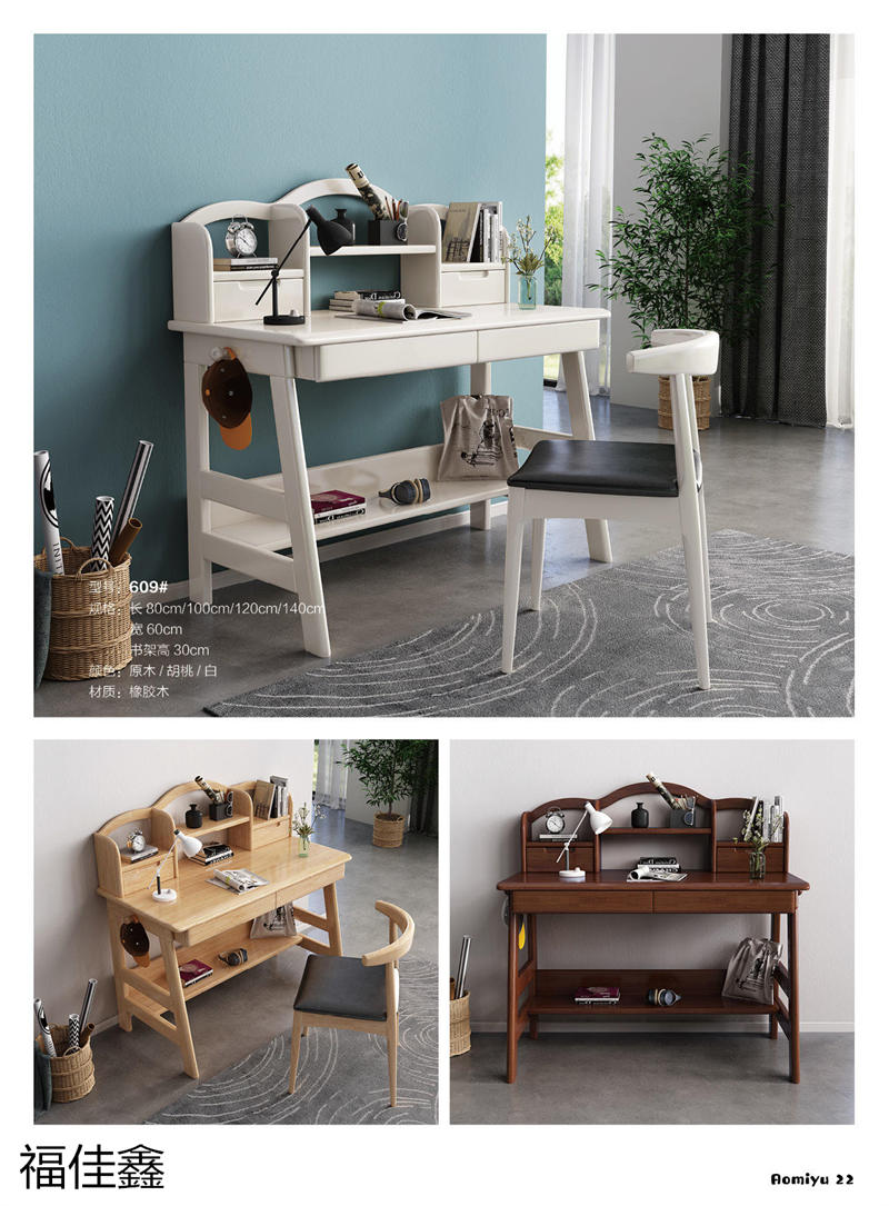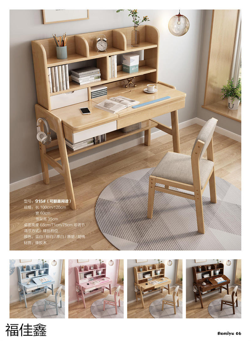 福佳鑫家具產品有:全實木升降款書桌系列、手搖升降兒童實木學習桌系列、小戶型書桌系列、簡易書桌(不帶書架)系列、輕奢巖板書桌系列、多功能帶書架書桌系列、極簡書架書柜系列、換鞋凳系列、衣帽架系列等產品,顏色有原木色、白色、藍白、粉白、黑色、寶馬灰等。