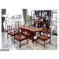現代新中式茶空間,南康剛果花梨木、印尼金花梨木茶臺、辦公桌、班臺、書柜、博古架,江西新中式古典實木茶臺,御秀聚美家具品牌生產廠家
