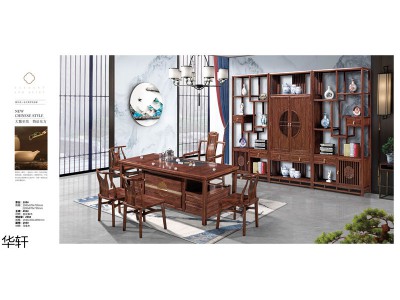 古典新中式風格辦公·茶室空間,南康實木茶桌、陽臺小茶臺,江西金花梨木、烏金木茶臺、博古架、大班臺、書桌、書柜,華軒家私生產廠家