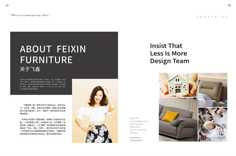 飛鑫家具始終堅持“以人為本”、“以質為根”的經營理念,高度注重全體員工素質與技能的提升和改進,以質求生存,以創新求發展。每一天我們都在不停探索尖端的科技,選取更環保的材料,創作出更精美的面料,每一件飛鑫家具產品都經得起時間的考驗,成為你對家眷戀的歸依。