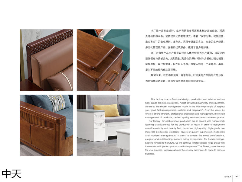 贛州市南康區中天家具有限公司是一家專業設計、生產和銷售各種高檔木材沙發的企業。采用先進的機器設備,堅持現代化的管理模式,本著“以您為尊,誠信經營,求實務實”的敬業原則。多年來,憑借著雄厚的實力、專業的生產經營、多元化管理的產品、完善的優質服務,贏得了客戶的好評。