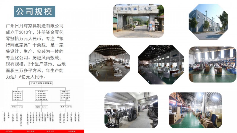 廣州日月輝家具制造有限公司成立于2010年,注冊資金壹億零捌拾萬元人民幣,專注“銀行網點家具”十余載,是一家集設計、生產、安裝為一體的專業化公司。歷經風雨數載,現有規模:2個生產基地,占地面積三萬多平方米,年生產能力達1.6億元人民幣。
