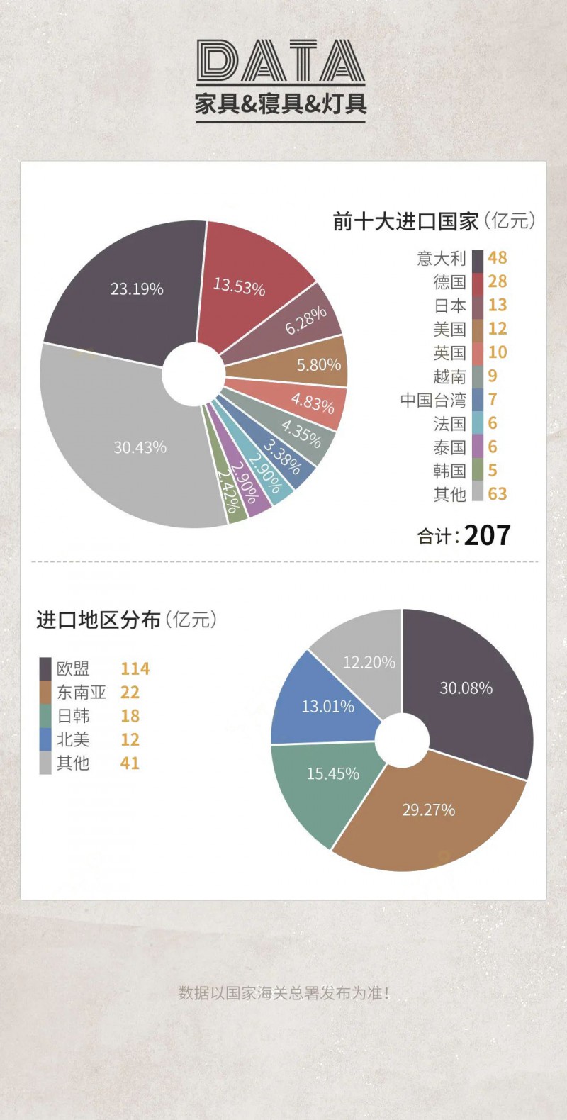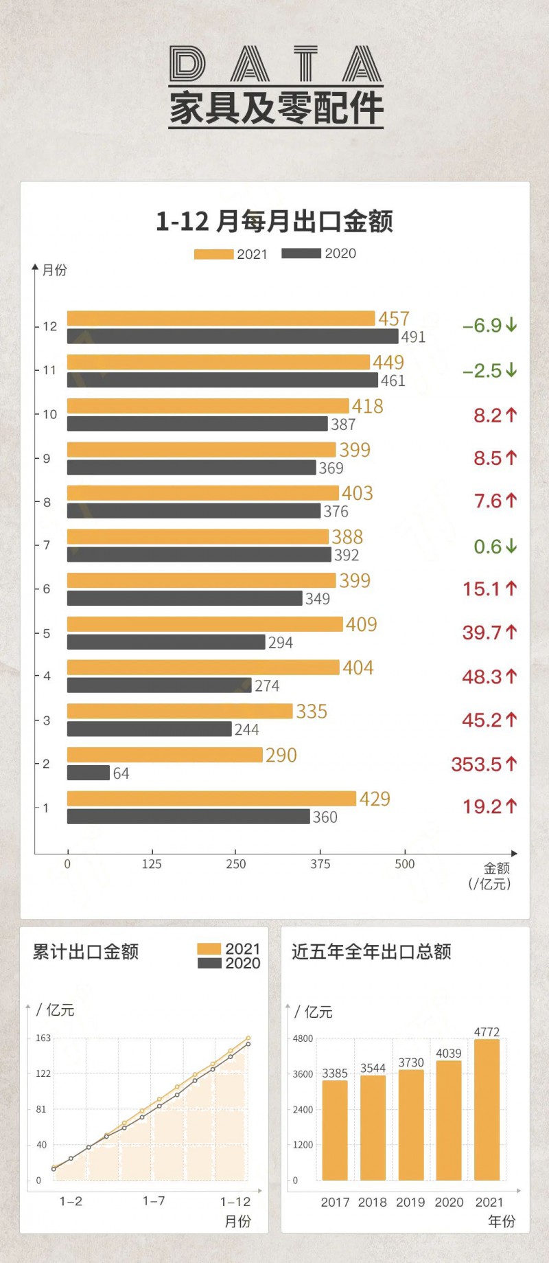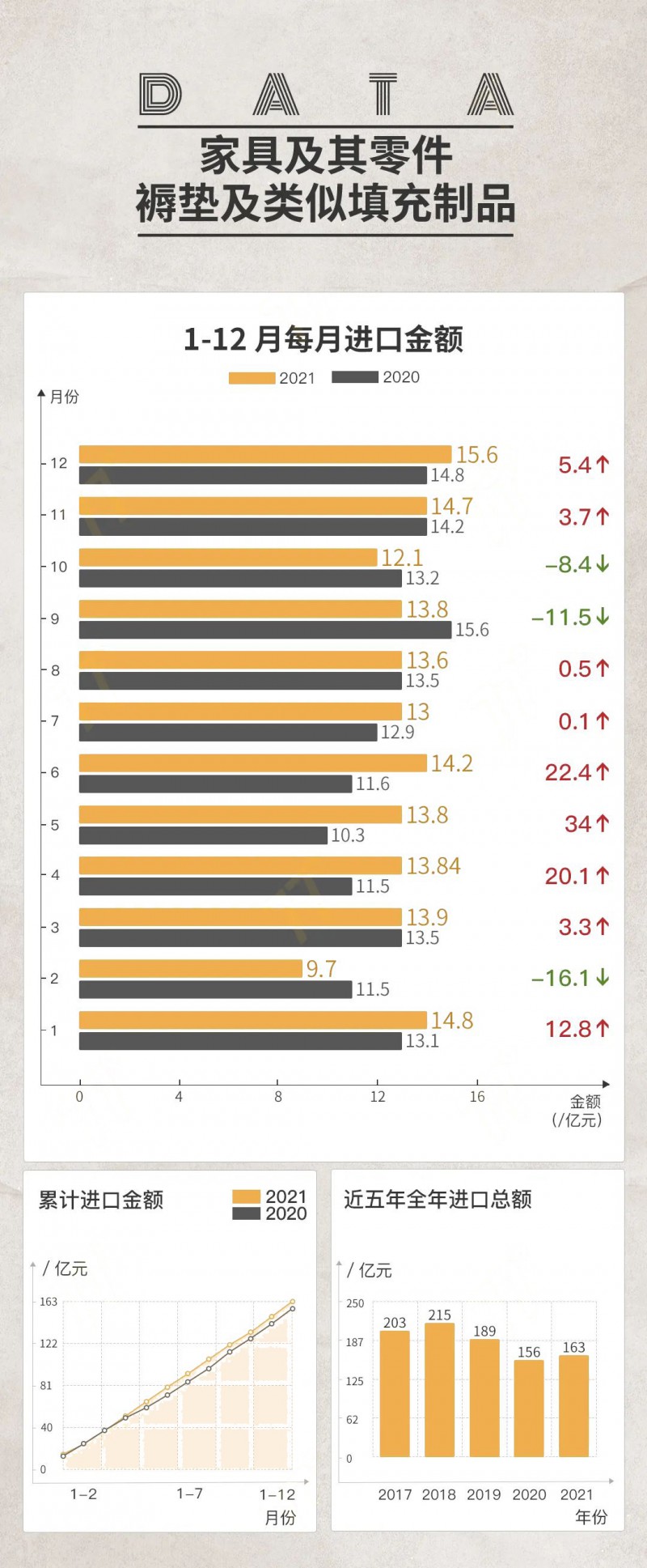 核心提示:1月19日,2021中國家居建材進出口大數據發布,家具、床墊、燈具、建筑裝飾陶瓷、板材等產品進出口總額都較2020年有所提升。