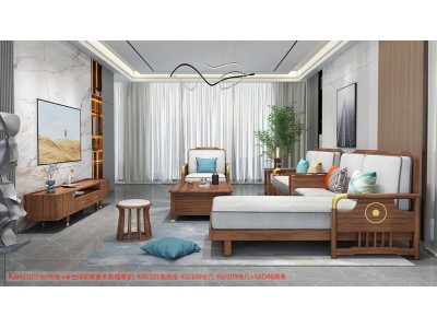 康優寶輕奢新中式胡桃木家具:K6H210沙發 轉角+單位(B靠背直條前框厚墊)