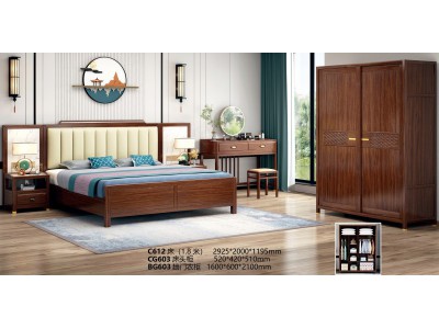 衛府里新中式烏金木C612床、CG603床頭柜、BG603趟門衣柜